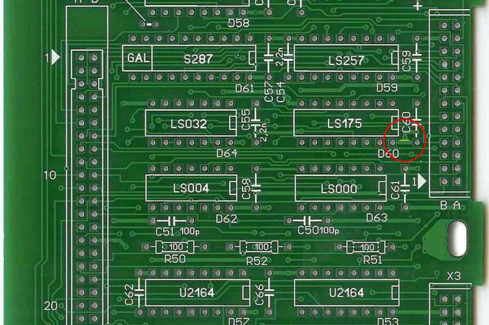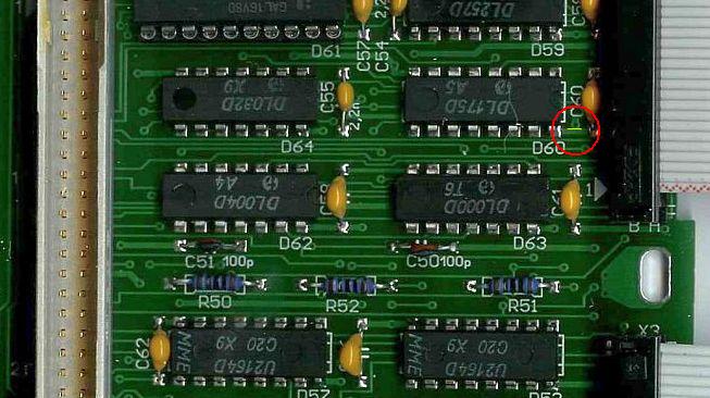 Leider hat sich auf der RAM-Platine ein Fehler eingeschlichen. Es gibt einen satten Schluß der 5P nach Masse. Es muß eine Verbindung auf der B-Seite aufgekratzt werden. Die Bilder zeigen, wo und wie.