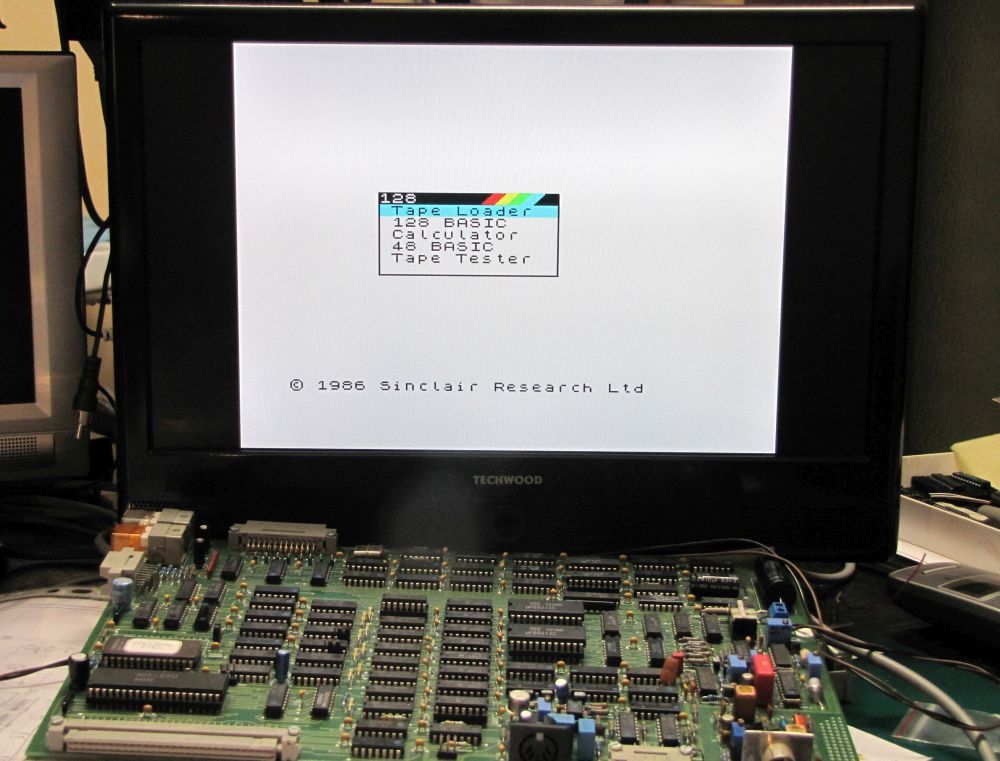 Nach dem Bestücken aller RAM-Schaltkreise gibt es das gewünschte Ergebnis nach dem Einschalten, der ZX-Spectral von 1986 meldet sich und nach Drücken der NMI-Taste meldet sich das System von 1982.