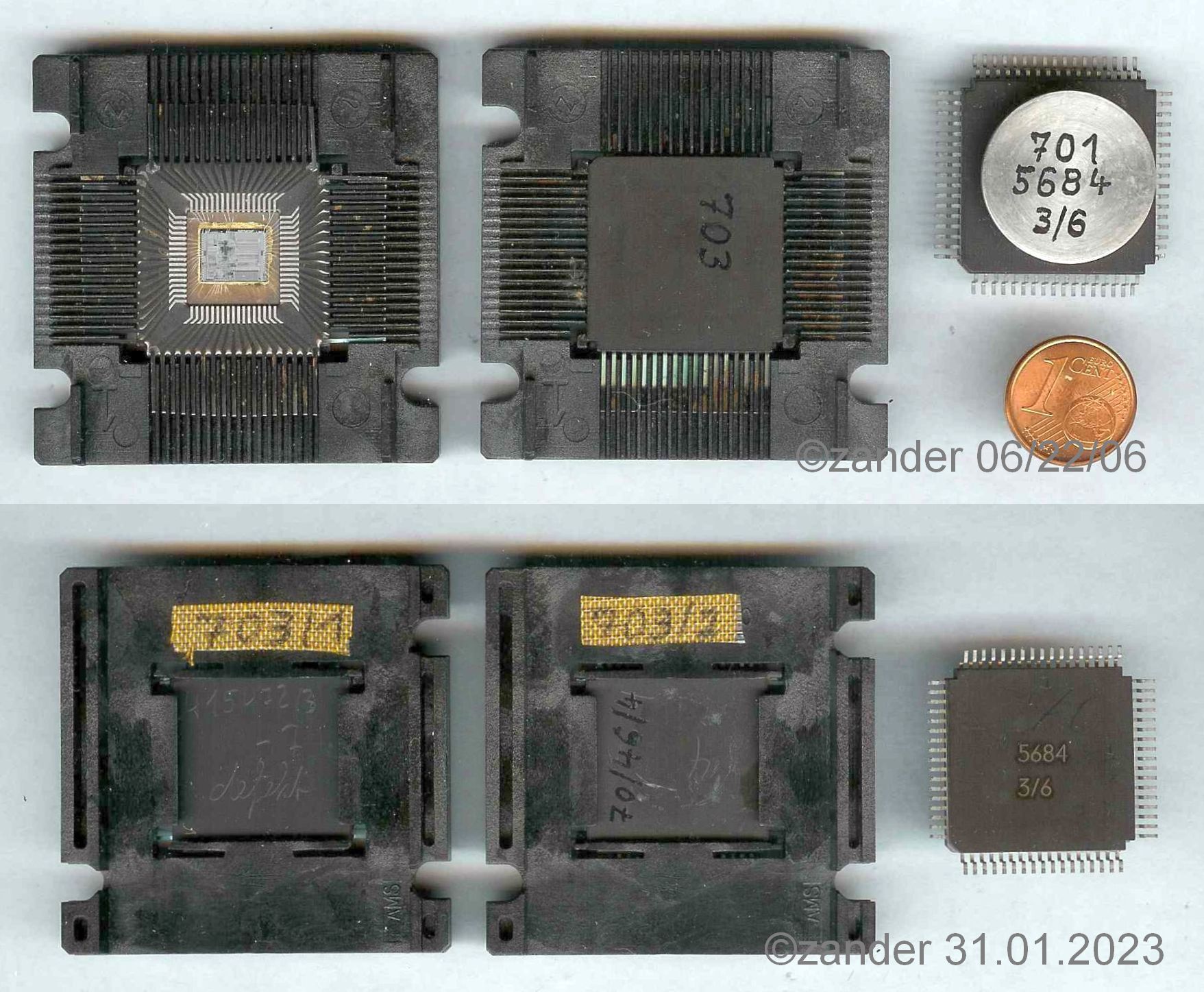 Speicherschaltkreis U61000C (1 Bit x 1MB) Speicherschaltkreis U2164 (1 Bit x 64kB) letzterer war als undicht ausgemustert, wurde mit Epoxydharz abgedichtet und im Privatbereich bis heute eingesetzt. rechts: ebenfalls ausgemusterte Schaltkreise, wurden in der Löttechnologie als Phantome eingesetzt. Privat ausgemessen und beschriftet. |