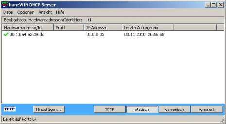 1. Der Serverrechner muß Pingpakete annehmen und die Ports 67 bis 69 (UDP) für DHCP/TFTP bedienen. Unter Windows ist der Feuerwall entsprechend einzurichten oder abzuschalten!